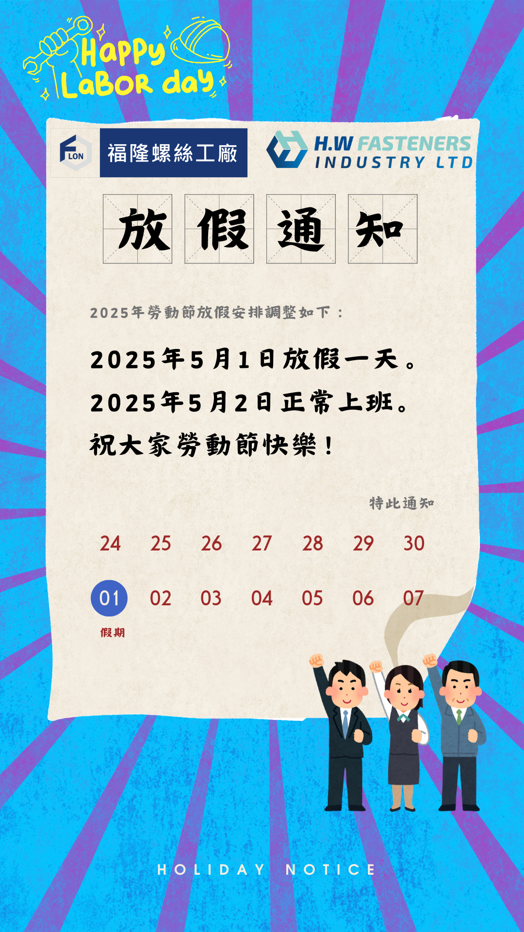 福隆螺絲工廠/亨旺螺絲於2025年5月1日勞動節放假ㄧ天。2025年5月2日不補假,正常上班。